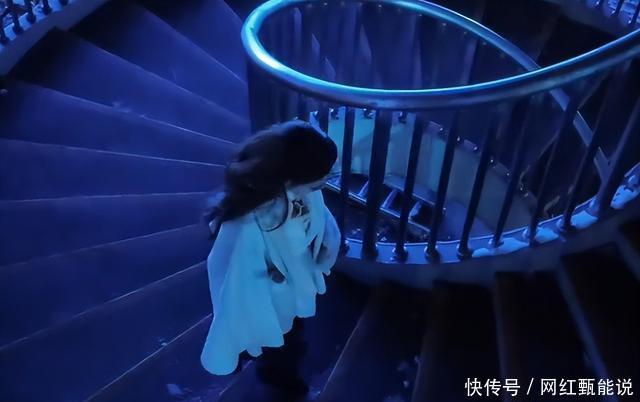 随后她又来到了一处天台上面,走的楼梯还是旋转的样子上面打上了蓝色的灯光,还挺有气氛的了摄影师则是在最上面的位置拍摄了这个镜头, 走到最上面的时候镜头拉近了拍摄马女士,她的脖子上面围了一根白色的围脖,脸上化着精致的妆容,不得不说她的长相真不错。